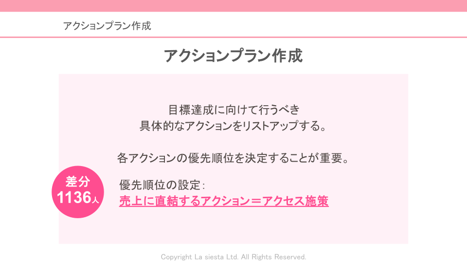 その中で、売上に直結する施策など優先度の高いアクションを明確にすることで、効率よく成果につなげることができます。