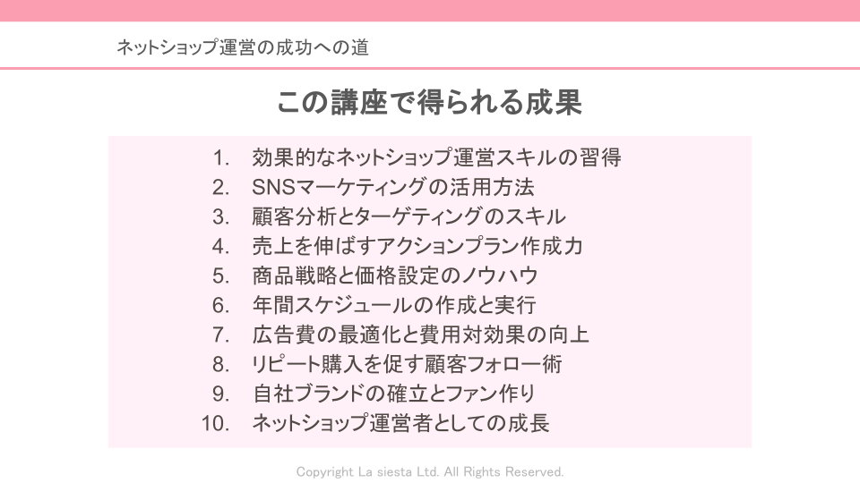 月2回の講座では、山口実加自身の13年間にわたるネットショップ運営の経験、そして150名以上の卒業生を成果に導いてきた実践ノウハウをもとに、再現性のある方法でお伝えしています。