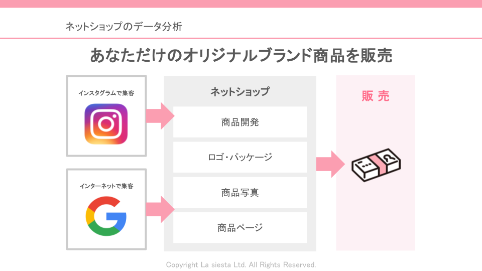 これらを一つずつ積み重ねることで、あなただけのオリジナルブランドとして、販売につながっていきます。