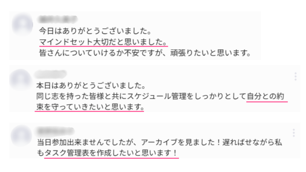「好き」だけにこだわるのではなく、勝てる分野を見極めたうえで、お金・時間・情熱という三つのリソースを確保し、ピッパの法則、目標を言葉にすること、そして環境のセットアップを実践する重要性をお伝えした講座となりました。