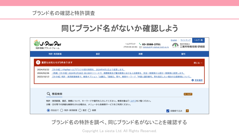 特許や商標を調べることで、安心してブランド名を使うことができ、トラブルを防ぐことができます