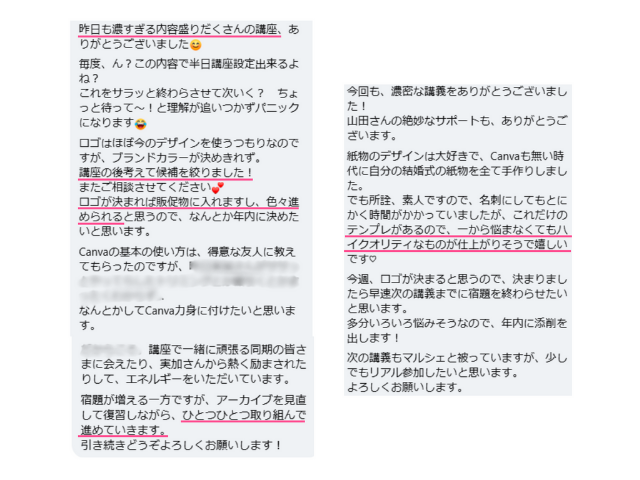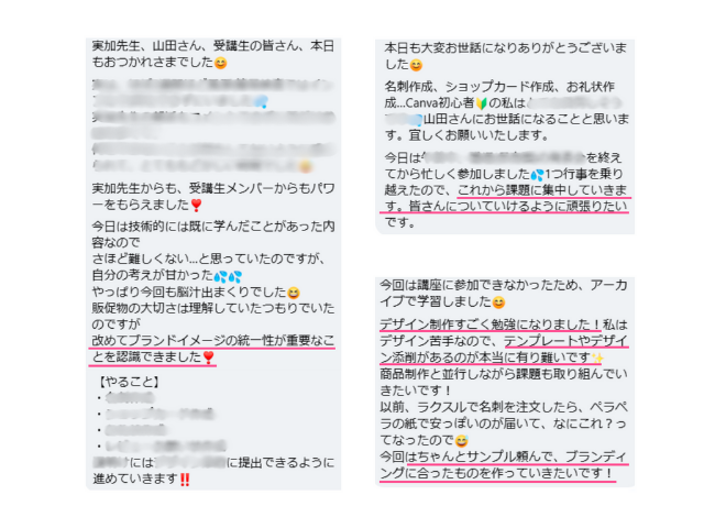 この講座を受けた方々からは、「改めてブランドイメージの統一する重要性を認識できました」「デザインの考え方がわかってすごく楽しい!」「テンプレがあるので、悩まずハイクオリティなものが仕上がりそう」「デザイン添削があるのがありがたいです」といった声が届いています。