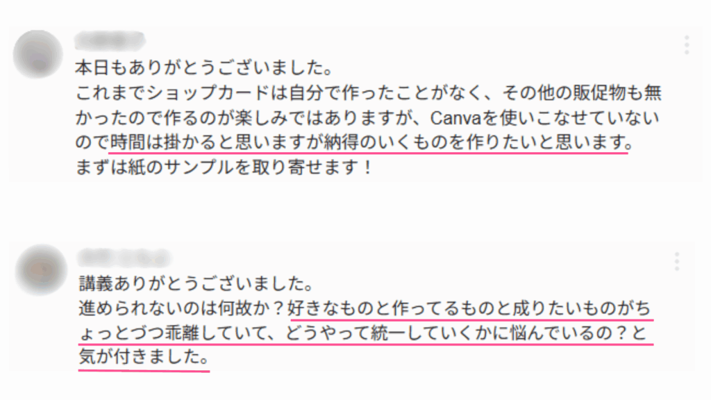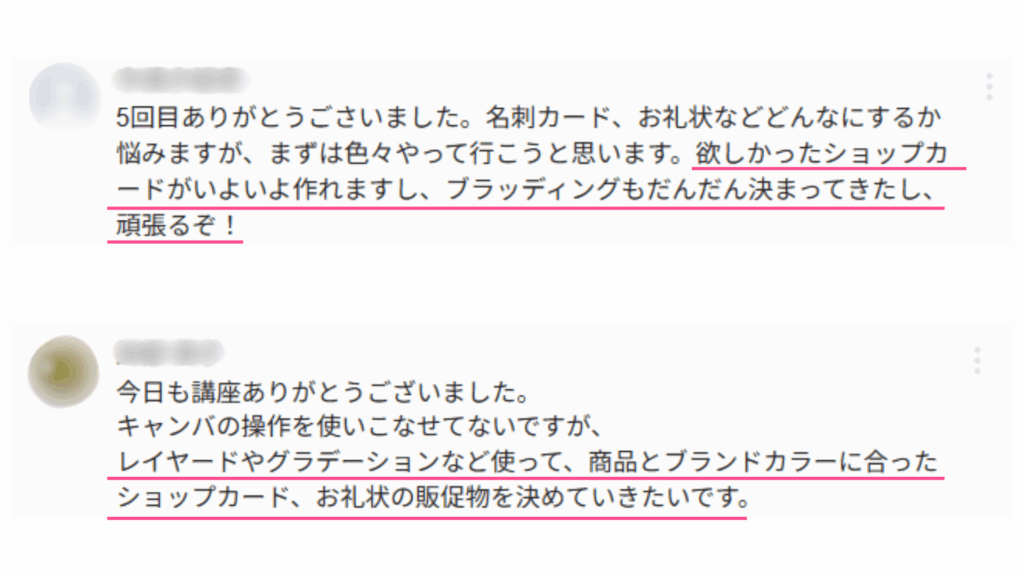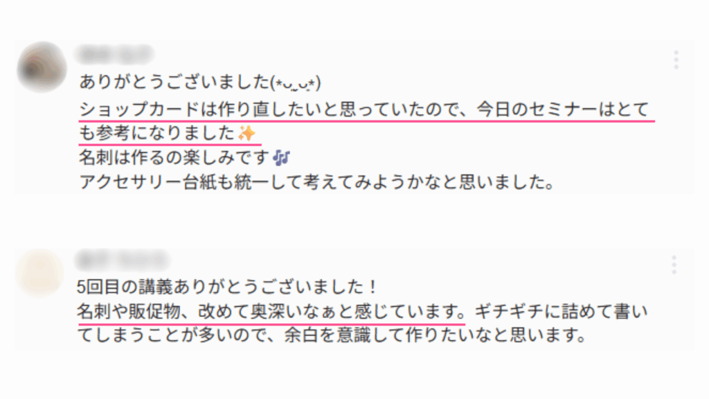 今回の講座では、ロゴやブランドカラーを活用した販促物の作り方や、お礼状・レビューの活用方法、カラー・フォント・レイアウトの基本デザインのポイントを学び、ブランドの魅力を伝えながらお客さまとの関係を深める工夫についてお伝えしました。