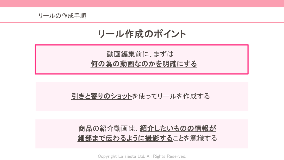 リール作成で最も大切なのは、「なんとなく作る」のではなく、目的を明確にすることです。