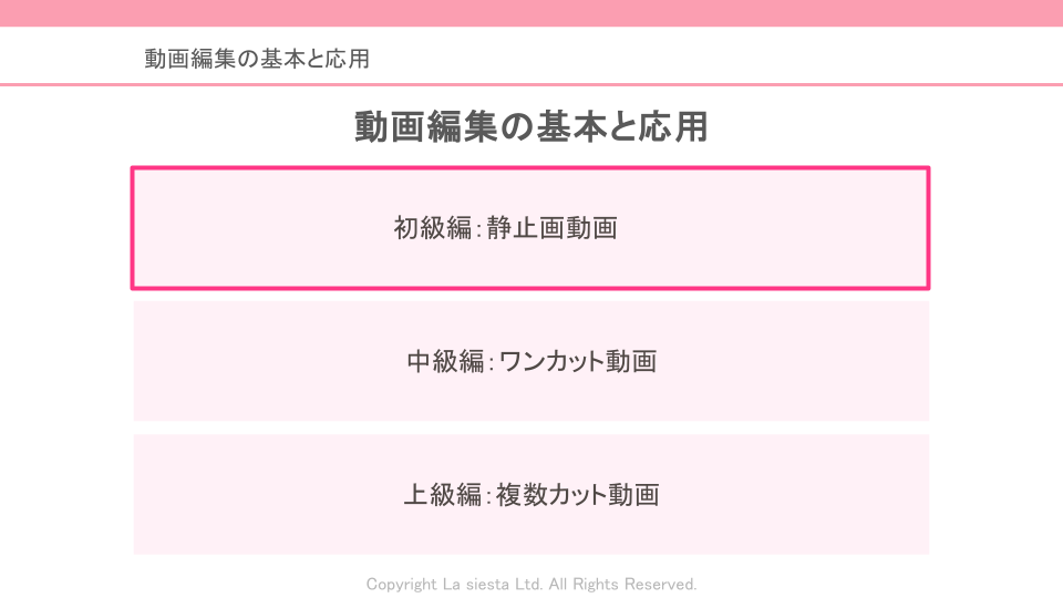 まず初級編では、写真やテキストを使った静止画動画を通して、編集の基本操作や構成の考え方を学びます。