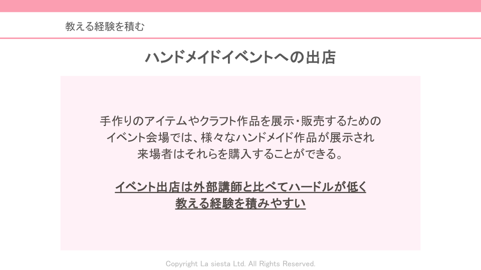 今回の講座では、ハンドメイドイベント出店のメリット・デメリットを理解した上で、経験を次の活動に活かす視点と、外部講師としてカルチャースクールなどで活動する仕組みや登録の流れを学び、自分に合った安定した活動スタイルを考える内容をお伝えしました。