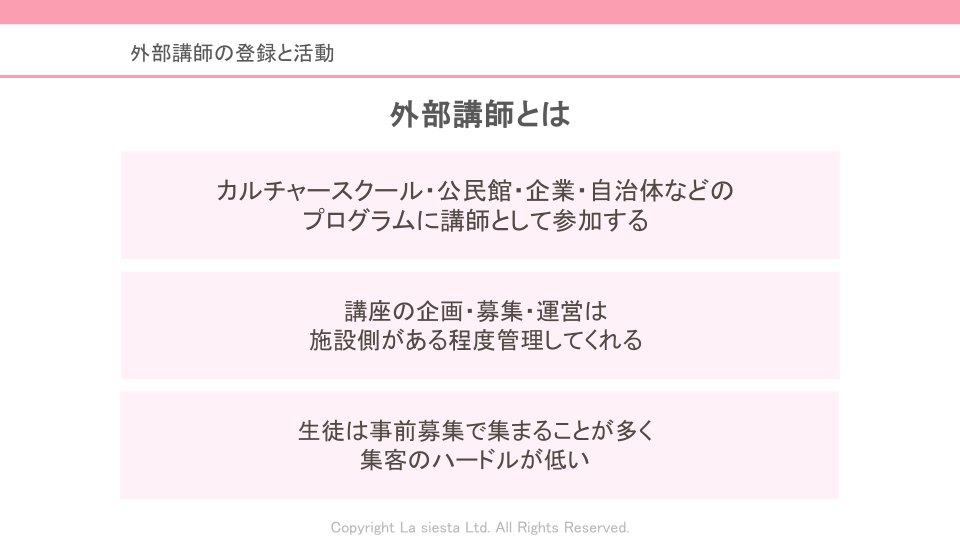 外部講師として活動する場合、カルチャースクールや公民館、企業、自治体などが主催する講座に参加します。