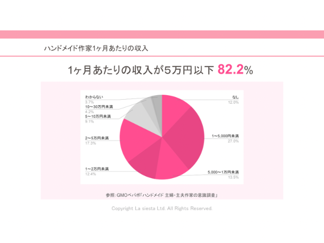 実際にネットショップサービス「minne」を運営するGMOペパボが公開している『ハンドメイド主婦・主夫作家の意識調査』によれば、月収5万円以下の作家は全体の82.2%。そのなかでも、わずか1〜5,000円未満しか稼げていない人が27.0%を占めています。これは趣味で楽しむ分には良いかもしれませんが、「仕事」として考えると現実的ではありません。